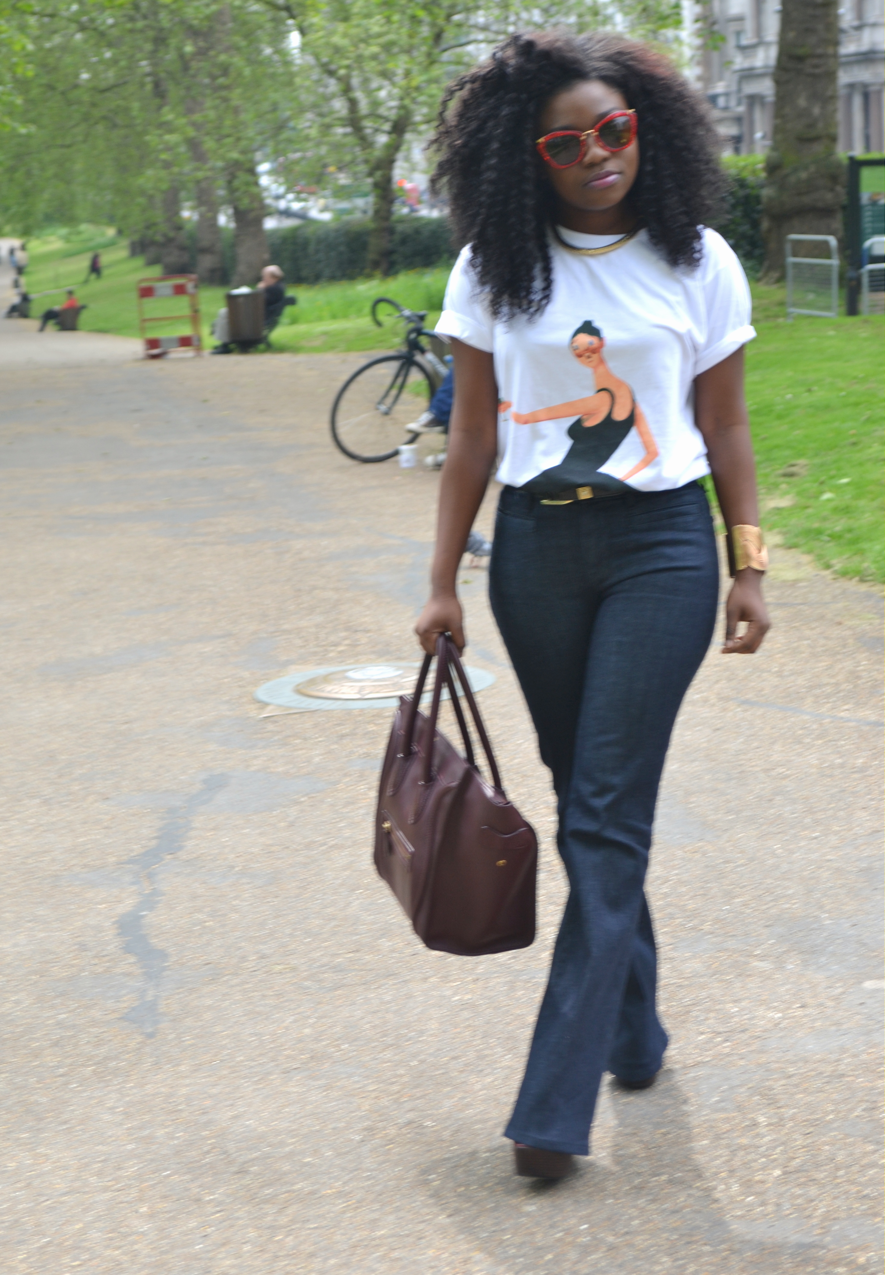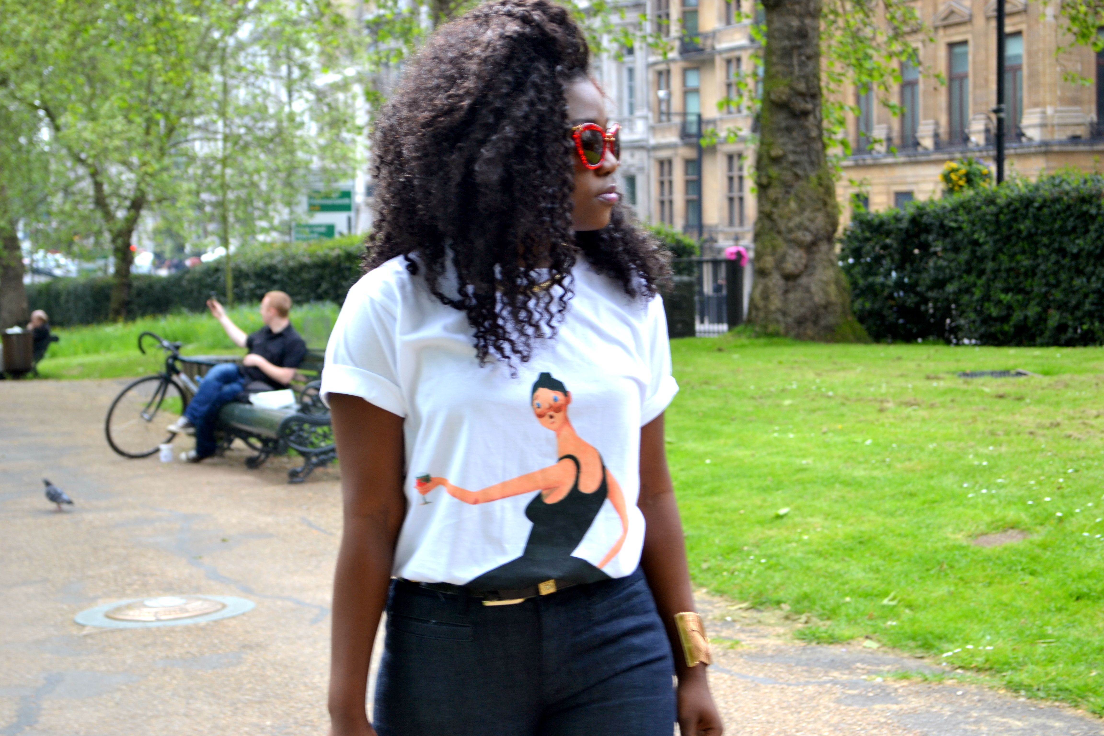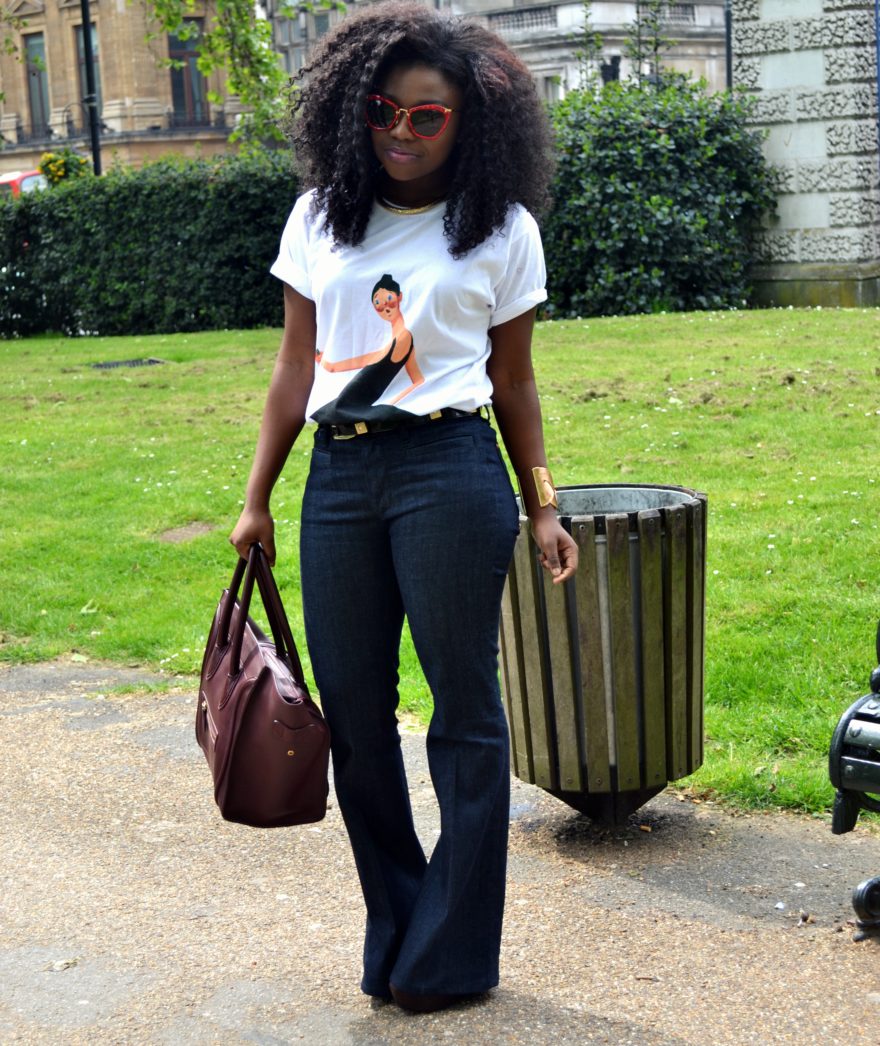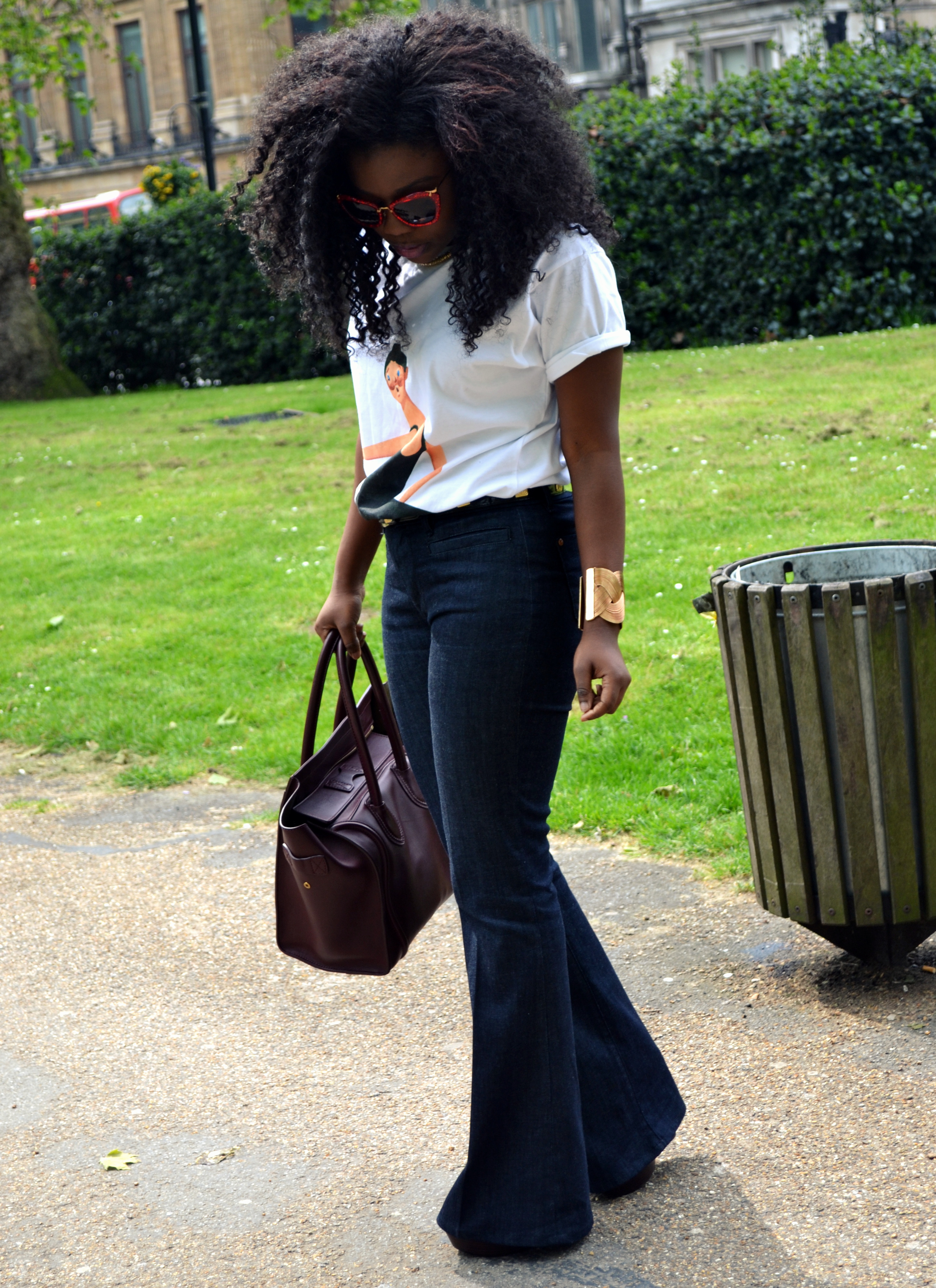 T-shirt is Watch The Throne Merchandise, Miu Miu sunglasses, Celine Bag, MiH Jeans