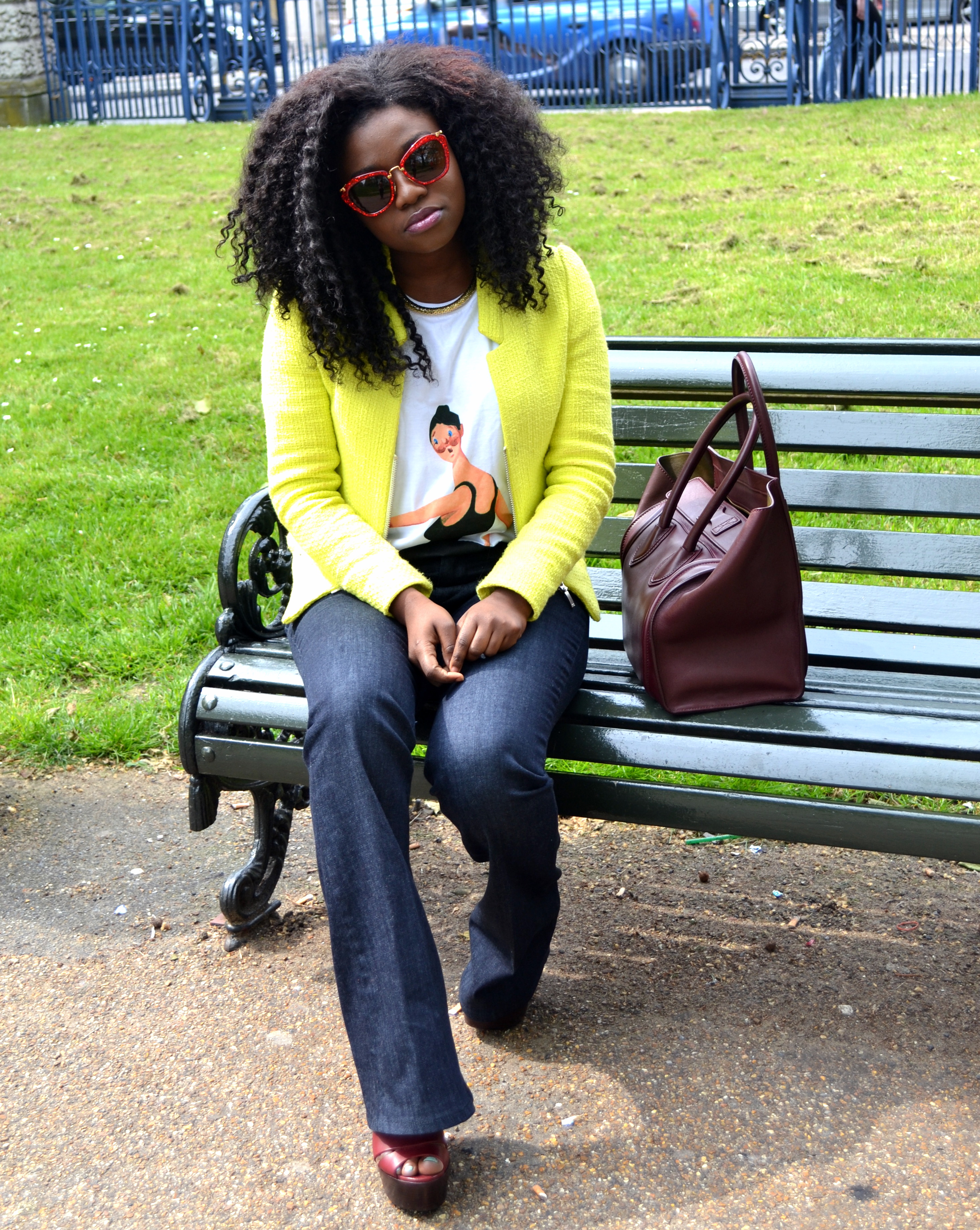T-shirt is Watch The Throne Merchandise, Miu Miu sunglasses, Celine Bag, MiH Jeans